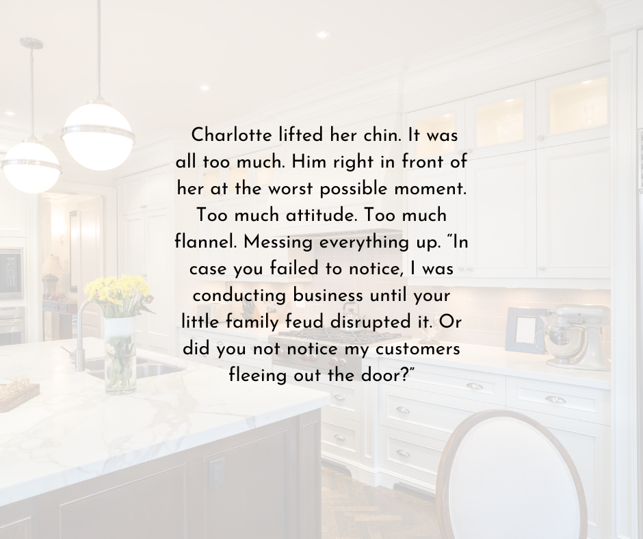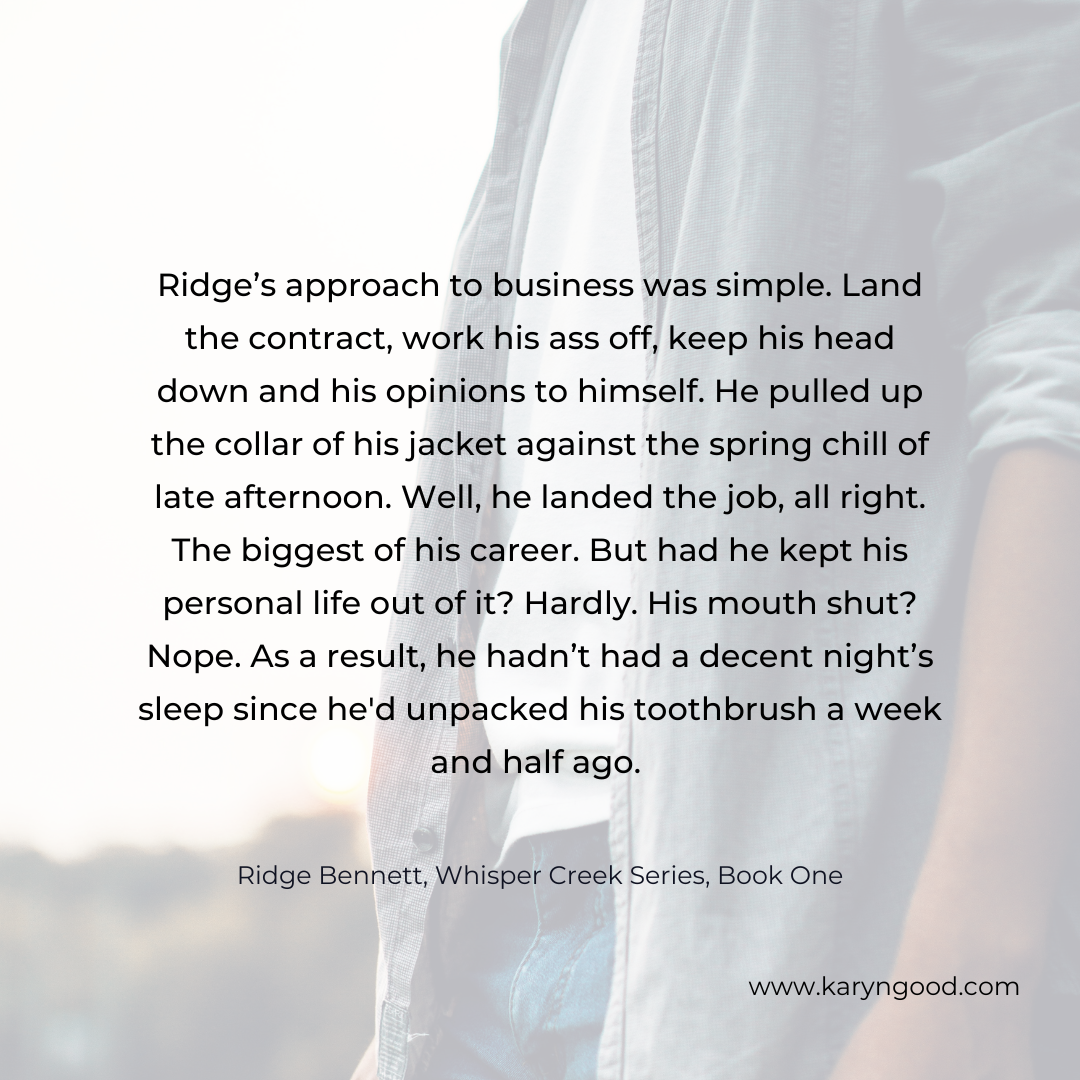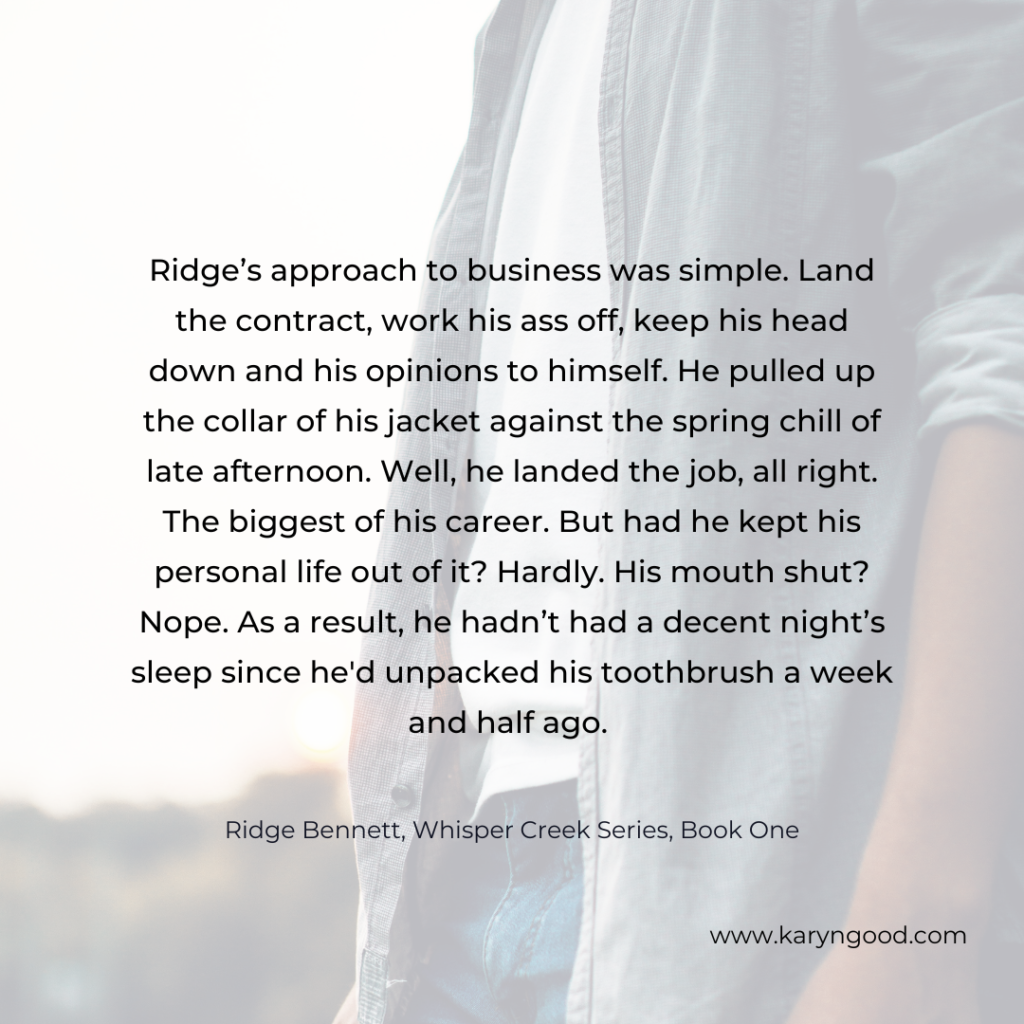 For now, I’m happy to be concentrating on Charlotte and Ridge and what’s happening in my fictional town of Whisper Creek.